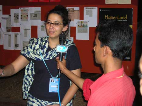 Marie-Clémence Paes donne une interview à la chaîne de TV bengladaise RTV. © laterit productions 2006