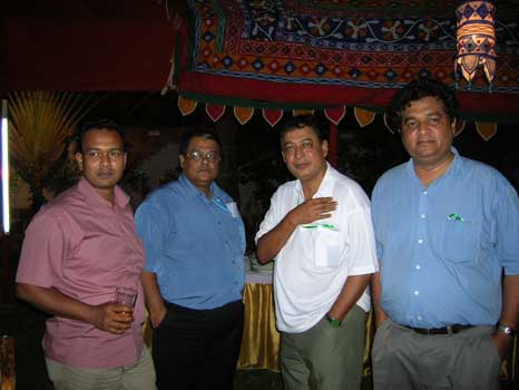 Les organisateurs du festival Ceux qui font le cinéma au Bengladesh : le programmateur, le producteur, le chef-opérateur et l'administrateur du festival devant un Ravinala. © laterit productions 2006