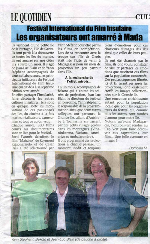 - 14 août : interview de Marie-Clémence Paes dans Les Nouvelles, à propos du cinéma malgache